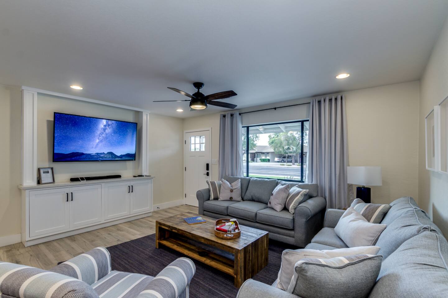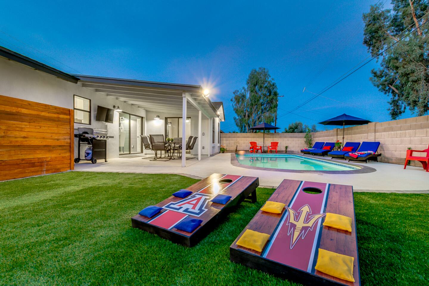 Relax inside with this beautifully remodeled four bedroom three full bathroom house with private pool (heated upon request)! There are 7 large screen TV's in this house including a 65" entertainment system in the Family Room and TV in every bedroom equipped with Cable and Roku. The family room, kitchen and dining room are large and open for a great entertaining space. The home also has a custom Game room with Pool Table and Dart Board and Separate Bar Area, tons of fun!! The remodel was just finished in April of 2018. The backyard also features a large swimming pool (heated upon request), outdoor dining table, fire pit, BBQ, Jacuzzi, corn hole game, and of course, large screen TV! Tpt lic #: 21487875 Scottsdale license #: 2033816